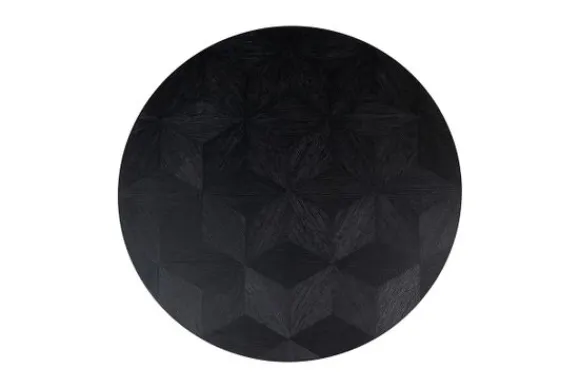 Het ronde blad van massief eikenhout heeft een verfijnd grafisch reliëf, wat samen met de kegelvormige basis zorgt voor een speelsheid in de ruimte.