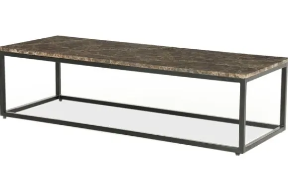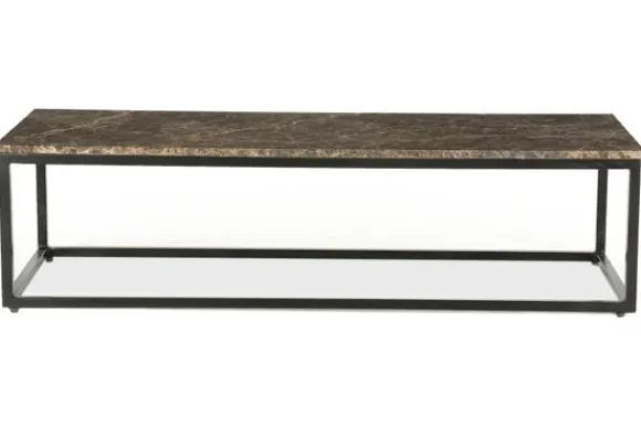Salontafel Rico 96332 van het merk Eleonora is een stijlvolle verkenning van balans, elegantie en kracht. Het slanke rechthoekige tafelblad is vervaardigd uit rijkbruin marmer, waarin levendige aders een spel van diepte en textuur creëren. Deze gepolijste steen vangt het licht op subtiele wijze, waardoor een zachte glans het oppervlak accentueert. De luxe uitstraling van het marmer contrasteert op verfijnde wijze met het industriële karakter van het gecoate ijzeren onderstel.