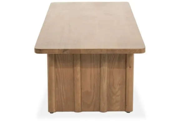 De salontafel is gemaakt van eikenhout en eiken fineer. Het royale tafelblad heeft afgeronde hoeken en laat de houtnerf goed zien. De bruine afwerking geeft het hout een warme en verzorgde uitstraling. Het onderstel bestaat uit verticale lamellen die zorgen voor een stabiele basis en een strak lijnenspel.