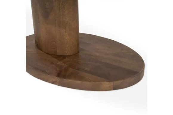 Het gladde houten blad rust op een solide basis, wat de tafel een stabiel en krachtig karakter geeft. De zachte lijnen en natuurlijke tint brengen een gevoel van harmonie in de woonkamer.