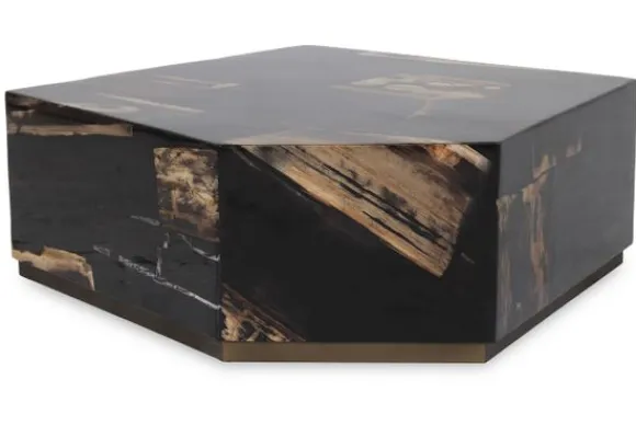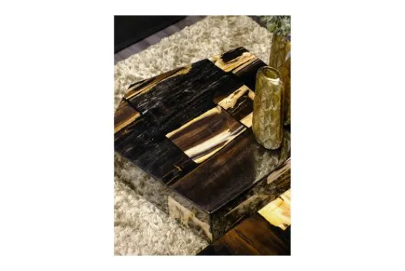 Salontafel Rayn Petrified Wood Large 706817 van het merk PTMD is een prachtige, luxe salontafel. De tafel is gemêleerd zwart met bruin/ crème met een glanzende afwerking door de polyesterhars topcoat. Het tafelblad heeft een hoogte van 31 cm en is gemaakt van gelamineerd versteend hout. Het materiaal van het onderstel is RVS met messing afgewerkt.