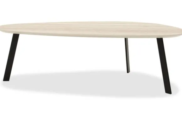 Het strakke tafelblad heeft een organische vorm en is gemaakt van hout met een hpl afwerking met een houten print. De zijkanten lopen taps af naar onder en geven een zachter afgerond uiterlijk.