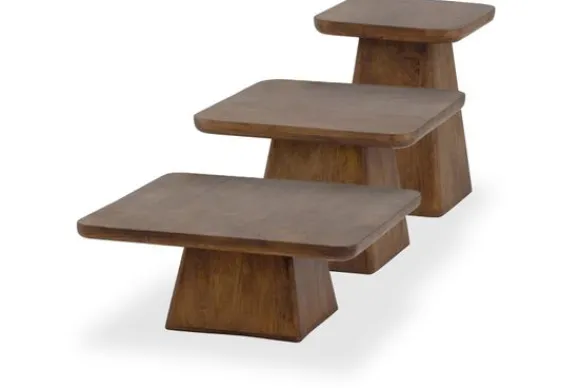 Salontafelset Stockholm is vervaardigd uit massief mangohout, een houtsoort die bekendstaat om zijn duurzaamheid en karakter. Het blad loopt taps af naar beneden en rust op een kegelvormige poot, wat de set een elegante en tijdloze uitstraling geeft.
