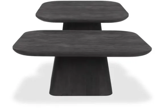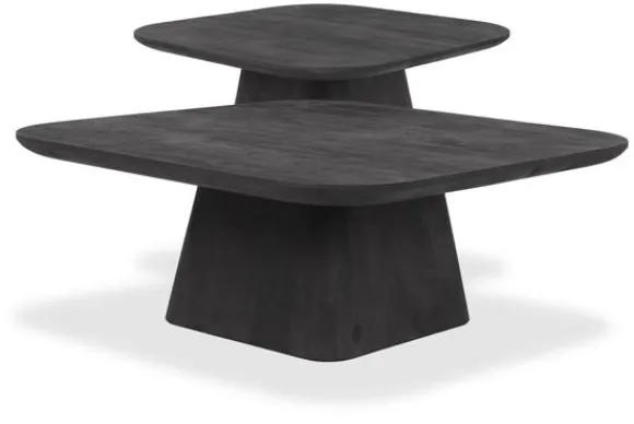 Salontafelset Aron van het merk Eleonora is een hedendaags duo van massief mangohout met een diepe, zwart geverfde afwerking. De afgeronde vierkante bladen lopen sierlijk taps af en rusten op een robuuste, kegelvormige poot – een subtiel spel tussen elegantie en kracht.
