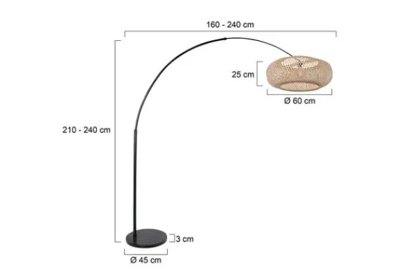 Vloerlamp Sparkled Light 7507ZW van het merk Steinhouwer is een zwart metalen, gebogen armatuur met een ronde blanke bamboe kap. De lamp is verstelbaar in zowel hoogte als diepte en de E27 fitting is ook nog eens verstelbaar, zo kun je precies licht geven waar je wilt. De maximale hoogte is 240cm en het armatuur is uitschuifbaar tot 240cm. De lamp is inclusief snoer van 250cm en voorzien van een vloerschakelaar. In combinatie met de juiste lichtbron is de lamp ook nog eens dimbaar.