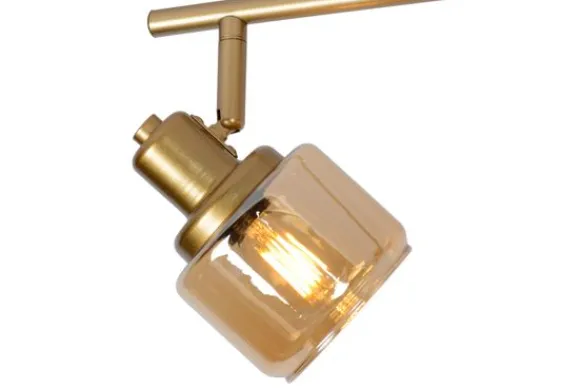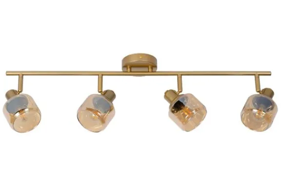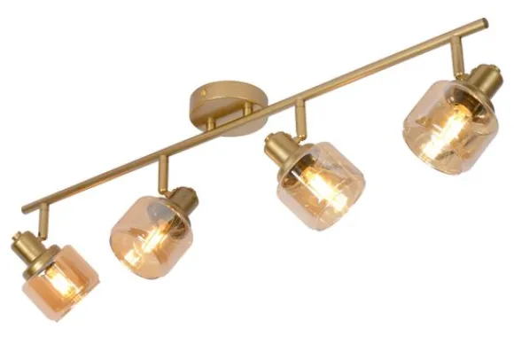 Plafondlamp Bjorn van het merk Lucide met vier spots is een krachtige mix van design en functionaliteit. De langwerpige, goudkleurige metalen balk vormt een stijlvol platform voor vier draaibare en kantelbare spots, elk voorzien van een warme amberkleurige glazen kap.
