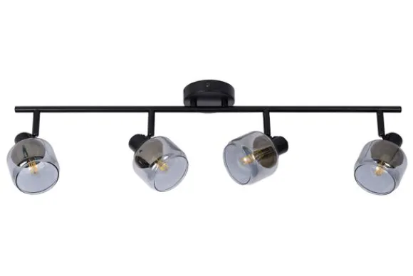 Plafondlamp Bjorn van het merk Lucide met vier spots is een krachtige mix van design en functionaliteit. De langwerpige, goudkleurige metalen balk vormt een stijlvol platform voor vier draaibare en kantelbare spots, elk voorzien van een warme amberkleurige glazen kap.