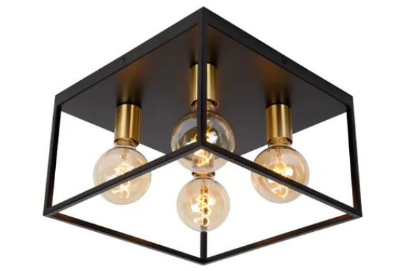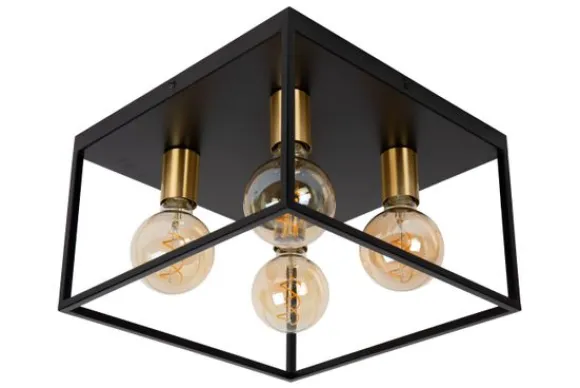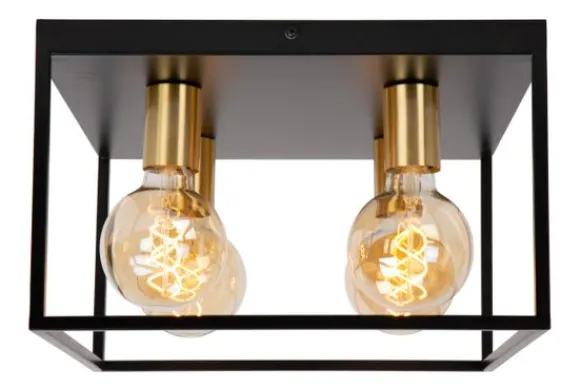 Plafondlamp Ruben van het merk Lucide is een stijlvolle mix van strakke lijnen en industriële elegantie. De open metalen frameconstructie geeft de lamp een ruimtelijk en grafisch karakter, terwijl de combinatie van matzwart met goudkleurige fittingen zorgt voor een luxe uitstraling.