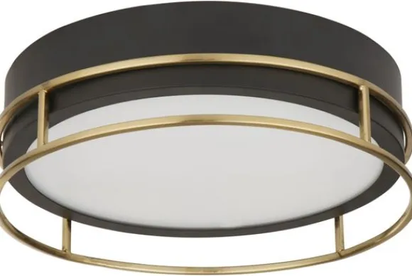 Plafondlamp Phoenix 62012-2PB van het merk Searchlight is een moderne zwart met gouden lamp die perfect is voor lage plafonds of kamers met minimale verticale ruimte. Deze lamp is in twee maten verkrijgbaar.
