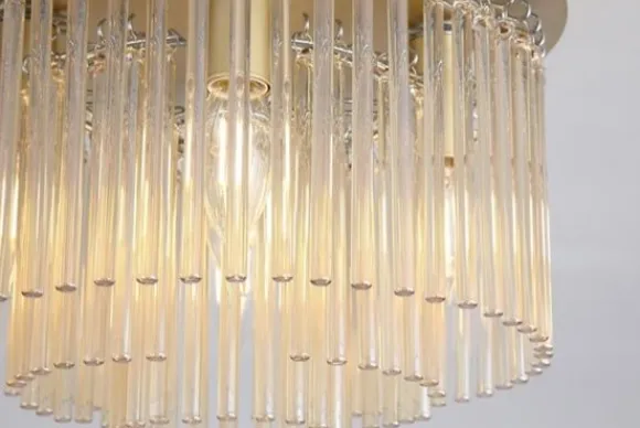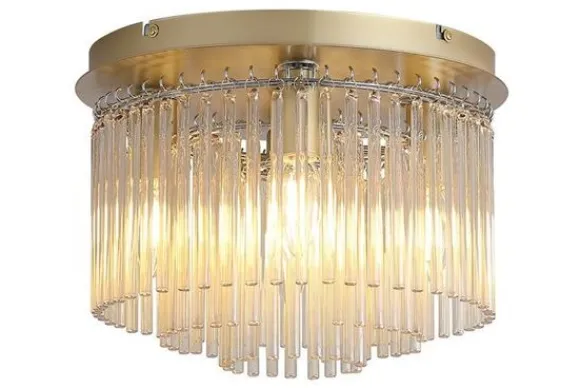 Plafondlamp Swizzle 55620-320CP van het merk Searchlight brengt een gevoel van luxe en elegantie in elke ruimte. De lamp is vervaardigd uit metaal en glas en heeft een opvallend ontwerp met verticale glazen buisjes die het licht op subtiele wijze verspreiden. De gouden afwerking zorgt voor een warme, verfijnde uitstraling.