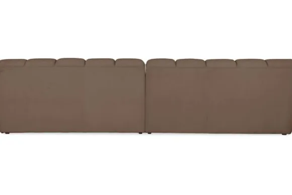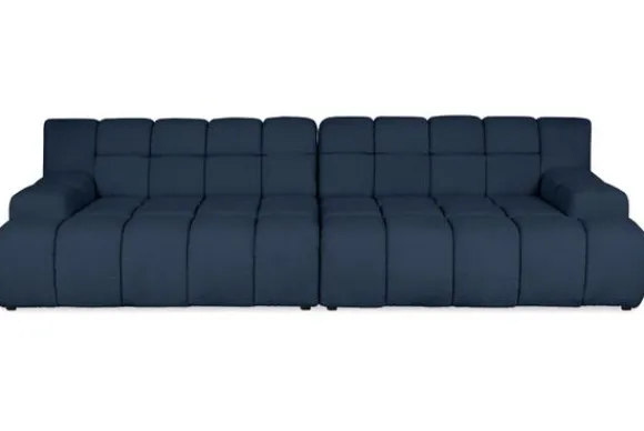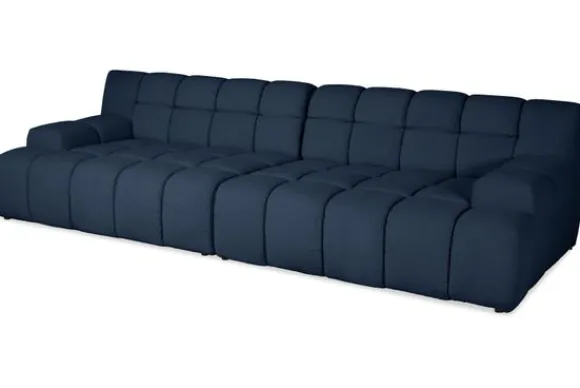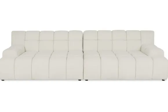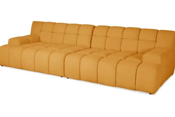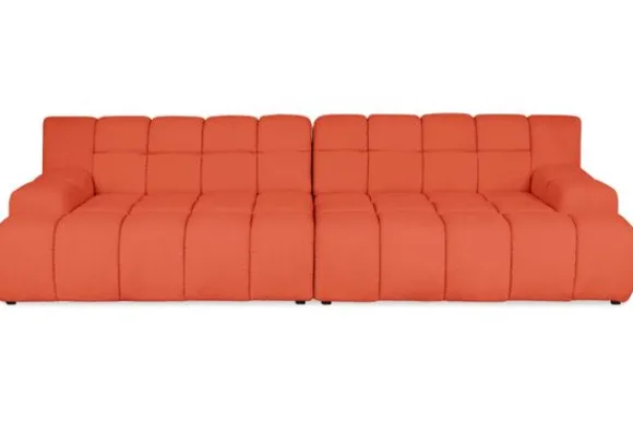 Bankstel Trentino van het merk Moderno is een bank met geblokte zit- en rugkussens en een zitting die doorloopt tot net boven de grond.