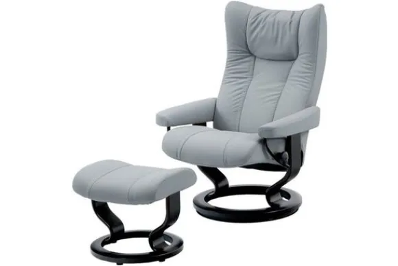 Relaxfauteuil Wing Classic van het merk Stressless is verkrijgbaar in meer dan 150 kleuren. Tevens is de fauteuil leverbaar in stof en rundleder. Je kunt bij deze fauteuil kiezen uit diverse maten zoals Small, Medium en Large. Deze fauteuil heeft een Plus en Glide Systeem: Aan beide zijden van de fauteuil zit een knop waarmee je de weerstand van de stoel kan aanpassen naar eigen behoefte. Door de knoppen in tegengestelde richting te draaien stel je jouw ideale relaxpositie samen. Op die manier krijgt de nek en de onderrug goede ondersteuning. Door de rugleuning naar voren te buigen activeer je de slaapfunctie. Op het moment dan je weer rechtop komt stelt de stoel zichzelf weer bij naar de normale stand.