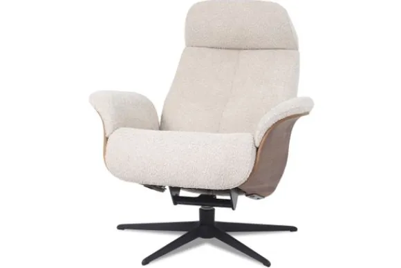 De stoel heeft stiksels in de rugleuning en naar buiten uitlopende armleuningen. Deze fauteuil wordt standaard uitgevoerd met een zwarte stervoet, armleuningen in de kleur nut oiled en exclusief de hocker. Je kunt dit aanpassen en bijbestellen onder ”Stel jouw relaxfauteuil samen”.