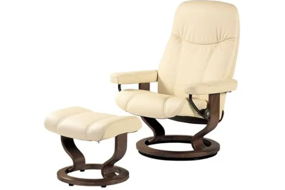 Relaxfauteuil Consul Classic van het merk Stressless is verkrijgbaar in alle kleuren. Tevens is de fauteuil leverbaar in stof en rundleder. Je kunt bij deze fauteuil kiezen uit diverse maten zoals Small, Medium en Large. Deze fauteuil heeft een Plus en Glide Systeem: Aan beide zijden van de fauteuil zit een knop waarmee je de weerstand van de stoel kan aanpassen naar eigen behoefte. Door de knoppen in tegengestelde richting te draaien stel je jouw ideale relaxpositie samen. Op die manier krijgt de nek en de onderrug goede ondersteuning. Door de rugleuning naar voren te buigen activeer je de slaapfunctie. Op het moment dan je weer rechtop komt stelt de stoel zichzelf weer bij naar de normale stand.