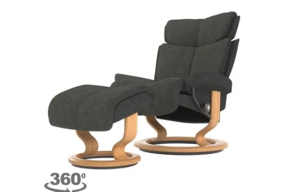 Relaxfauteuil Magic Classic van het merk Stressless is verkrijgbaar in alle kleuren. Tevens is de fauteuil leverbaar in stof en rundleder. Je kunt bij deze fauteuil kiezen uit diverse maten zoals Small, Medium en Large. Deze fauteuil heeft een Plus en Glide Systeem: Aan beide zijden van de fauteuil zit een knop waarmee je de weerstand van de stoel kan aanpassen naar eigen behoefte. Door de knoppen in tegengestelde richting te draaien stel je jouw ideale relaxpositie samen. Op die manier krijgt de nek en de onderrug goede onderstuening. Door de rugleuning naar voren te buigen activeer je de slaapfunctie. Op het moment dan je weer rechtop komt stelt de stoel zichzelf weer bij naar de normale stand.