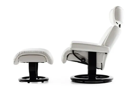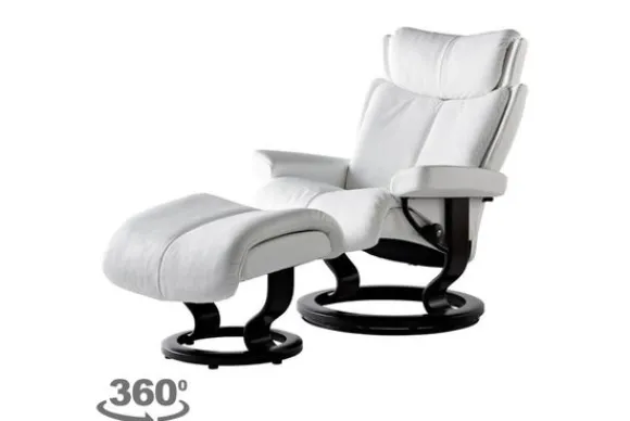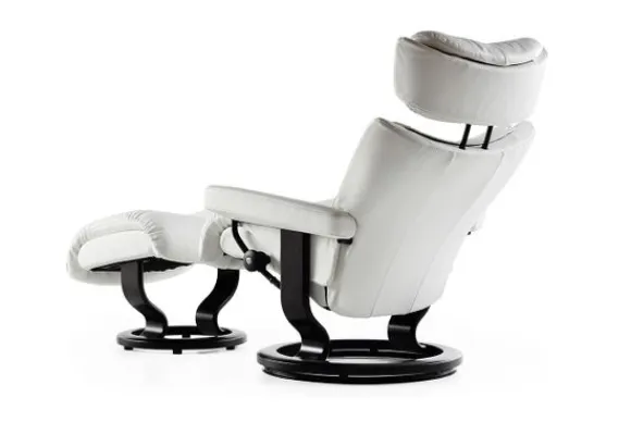 Relaxfauteuil Magic Classic van het merk Stressless is verkrijgbaar in alle kleuren. Tevens is de fauteuil leverbaar in stof en rundleder. Je kunt bij deze fauteuil kiezen uit diverse maten zoals Small, Medium en Large. Deze fauteuil heeft een Plus en Glide Systeem: Aan beide zijden van de fauteuil zit een knop waarmee je de weerstand van de stoel kan aanpassen naar eigen behoefte. Door de knoppen in tegengestelde richting te draaien stel je jouw ideale relaxpositie samen. Op die manier krijgt de nek en de onderrug goede onderstuening. Door de rugleuning naar voren te buigen activeer je de slaapfunctie. Op het moment dan je weer rechtop komt stelt de stoel zichzelf weer bij naar de normale stand.