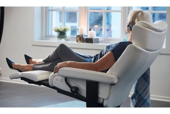 Ook heeft deze fauteuil een Power functie: Bij deze functie worden de drie geïntegreerde motoren allemaal afzonderlijk van elkaar bediend door middel van de bevestigde afstandsbediening. Met de touchbediening kun je de bewegingen synchroniseren zodat de rug, benen en hoofd worden ondersteund.