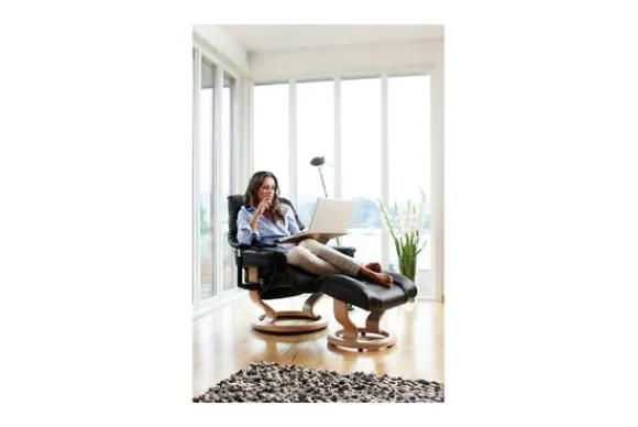 Relaxfauteuil Reno Classic van het merk Stressless is verkrijgbaar in alle kleuren. Tevens is de fauteuil leverbaar in stof en rundleder. Je kunt bij deze fauteuil kiezen uit diverse maten zoals Small, Medium en Large. Deze fauteuil heeft een Plus en Glide Systeem: Aan beide zijden van de fauteuil zit een knop waarmee je de weerstand van de stoel kan aanpassen naar eigen behoefte. Door de knoppen in tegengestelde richting te draaien stel je jouw ideale relaxpositie samen. Op die manier krijgt de nek en de onderrug goede ondersteuning. Door de rugleuning naar voren te buigen activeer je de slaapfunctie. Op het moment dan je weer rechtop komt stelt de stoel zichzelf weer bij naar de normale stand.