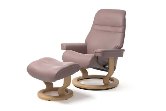 Relaxfauteuil Sunrise Classic van het merk Stressless is verkrijgbaar in alle kleuren. Tevens is de fauteuil leverbaar in stof en rundleder. Je kunt bij deze fauteuil kiezen uit diverse maten zoals Small, Medium en Large. Deze fauteuil heeft een Plus en Glide Systeem: Aan beide zijden van de fauteuil zit een knop waarmee je de weerstand van de stoel kan aanpassen naar eigen behoefte. Door de knoppen in tegengestelde richting te draaien stel je jouw ideale relaxpositie samen. Op die manier krijgt de nek en de onderrug goede onderstuening. Door de rugleuning naar voren te buigen activeer je de slaapfunctie. Op het moment dan je weer rechtop komt stelt de stoel zichzelf weer bij naar de normale stand.