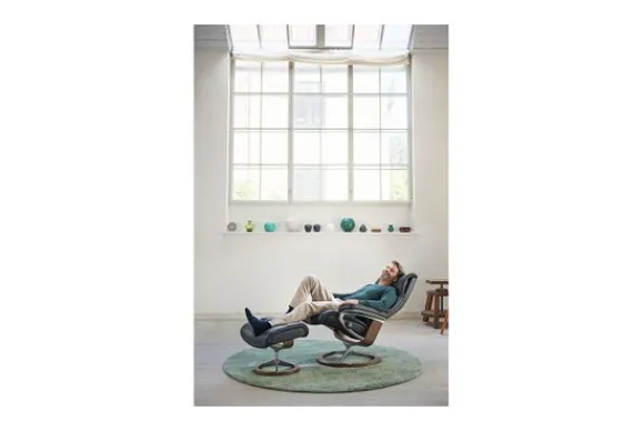 Relaxfauteuil View Signature van het merk Stressless is verkrijgbaar in meer dan 150 kleuren. Tevens is de fauteuil leverbaar in stof en rundleder. Je kunt bij deze fauteuil kiezen uit diverse maten zoals Small, Medium en Large. Deze fauteuil heeft een Plus en Glide Systeem: Aan beide zijden van de fauteuil zit een knop waarmee je de weerstand van de stoel kan aanpassen naar eigen behoefte. Door de knoppen in tegengestelde richting te draaien stel je jouw ideale relaxpositie samen. Op die manier krijgt de nek en de onderrug goede ondersteuning. Door de rugleuning naar voren te buigen activeer je de slaapfunctie. Op het moment dan je weer rechtop komt stelt de stoel zichzelf weer bij naar de normale stand.
