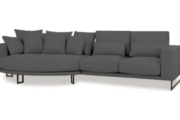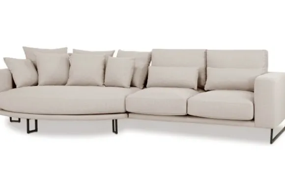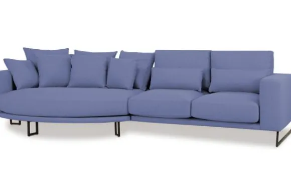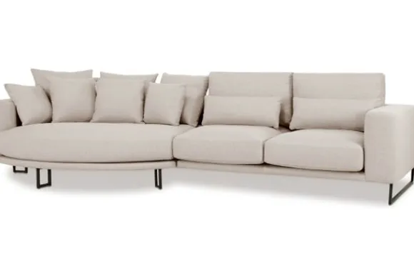 Loungebank Dordoni II van het merk Be Inspired is verkrijgbaar in alle kleuren en in verschillende materiaalsoorten zoals ribstof, teddy en velvet. Je kunt kiezen uit diverse afmetingen. De Dordoni II bank wordt standaard uitgevoerd met alle sierkussens en lendekussens die ook op de foto te zien zijn. De rugkussens daar achter zijn lekker hoog, deze combinatie zorgt voor een goede ondersteuning van de rug. Alle rugkussens zitten los en zijn omkeerbaar, de zitkussens zitten vast met klittenband. Het unieke aan de Dordoni II is het ronde loungegedeelte. Je kunt hier lekker wegkruipen tussen alle sierkussens. Deze bank oogt ruimtelijk door de hoge metalen sledepoten.