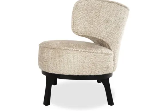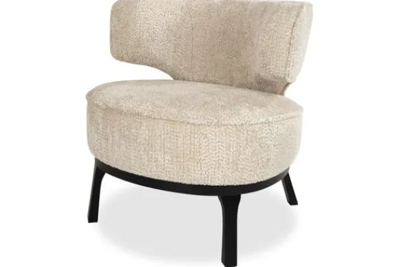 De subtiele bies benadrukt de elegante ronde vormen van de fauteuil en zorgt voor een verfijnd accent. Het zwarte houten onderstel biedt stabiliteit en vormt een stijlvol contrast met de bekleding.