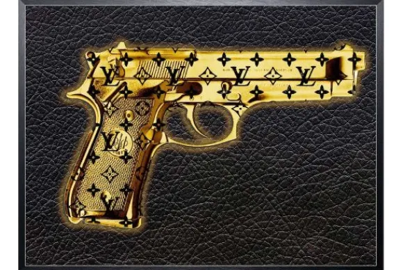 Art Print Louis Pistool GUN-076 van het merk Luxe Framing Art is verkrijgbaar in verschillende afmetingen. Op deze print zie je een gouden pistool, bestempeld met het Louis Vuitton logo. De achtergrond is een afbeelding van zwart leer. Deze Art Print wordt standaard met een zwarte lijst geleverd.