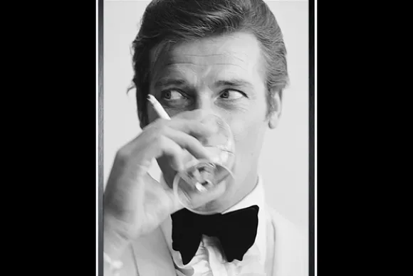 Art Print Shaken, not Stirred APA188 van het merk Luxe Framing Art is verkrijgbaar in verschillende afmetingen. Op deze zwart-witprint is Roger Moore als James Bond afgebeeld, terwijl hij een slok neemt van zijn vodka martini. Deze Art Print wordt standaard geleverd met een zwarte lijst.