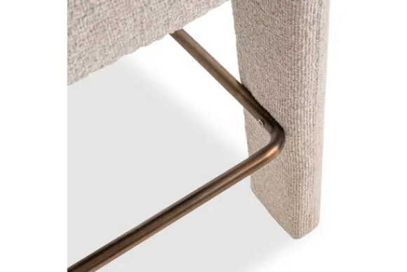 De barkruk staat op stevige poten die volledig zijn meegestoffeerd. De metalen voetensteun in een bronzen kleur geeft extra comfort en een mooi contrast.
