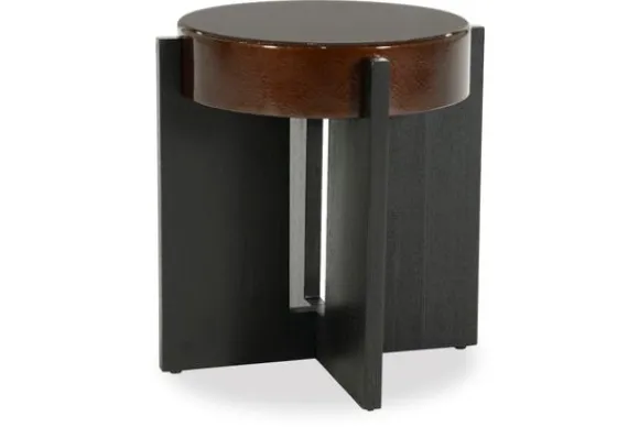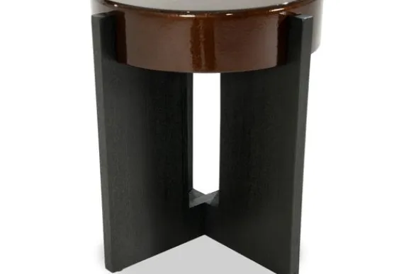 Bijzettafel Juliet 96323 bruin van het merk Eleonora heeft een rond tafelblad die met zijn shiny shell painting in een diepe koperbruine tint haast vloeibaar gegoten over de rand lijkt te glijden. De rijke glans en subtiele structuur van het blad vangen het licht als een edelsteen. Ondersteund door een geometrisch onderstel van MDF met eiken fineer in een diepe zwarte afwerking, ontstaat er een harmonieus contrast tussen lichtreflectie en aardse diepte. De kruisvormige basis voegt niet alleen stabiliteit toe, maar benadrukt ook de sculpturale allure van het ontwerp.
