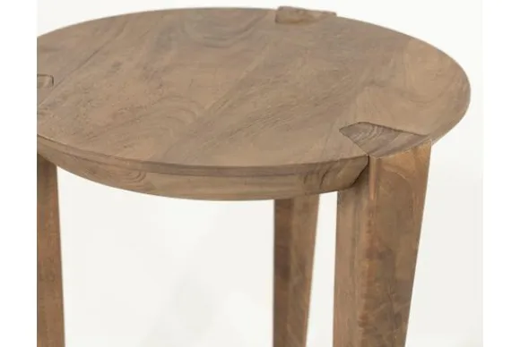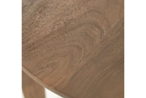 Het onderstel, bestaande uit drie elegant uitlopende poten die naadloos doorlopen in het blad. Geen enkel tafelblad is hetzelfde met het puur geborstelde mangohout, waardoor deze ronde tafel een perfecte, unieke aankleding geeft.