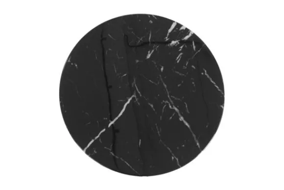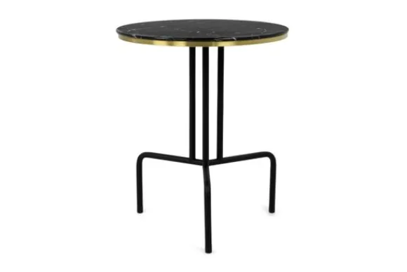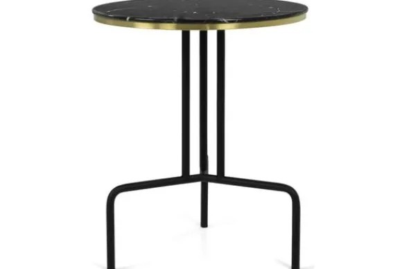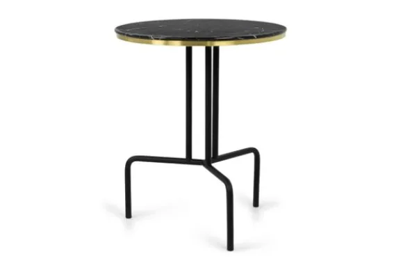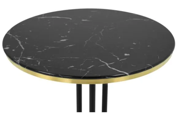 Bijzettafel Vieve van het merk Aynur Nova is beschikbaar in diverse afmetingen. Deze tafel heeft een diameter van 50 cm. De salontafel krijgt een chique uitstraling door het zwarte marmeren blad met de gouden rand en de metalen poot.