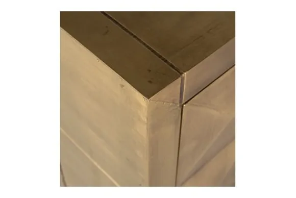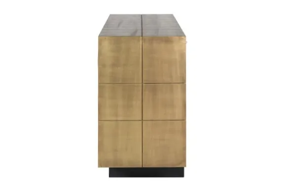 Dressoir Collada 211247 van het merk Richmond Interiors heeft een luxe uitstraling door zijn strakke vorm gecombineerd met het design, in de anieke brasskleur (staal in mat goud). Brass is een legering van koper en zink, dat vervolgens wordt afgewerkt met een geborsteld effect. Dit zorgt voor een matte afwerking. Brass is eenvoudig schoon te maken met een lichtvochtige doek, het nadrogen van het oppervlak zorgt voor een streeploos resultaat. Het dressoir is voorzien van drie deurtjes met daarachter een opbergruimte, met één plank die de ruimte in tweeën deelt. De deurtjes zijn te openen en sluiten door middel van een push to open systeem.