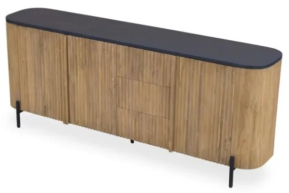 Dressoir Palazzo van het merk Tower Living is een stijlvol en functioneel meubelstuk met een verfijnde uitstraling. Gemaakt van massief teak straalt dit dressoir een natuurlijke warmte uit, terwijl de subtiele verticale lijnen in de deuren en lades zorgen voor een elegant ritmisch effect. De afgeronde hoeken en het zwarte blad geven het ontwerp een moderne touch, terwijl de slanke metalen poten een luchtige uitstraling creëren. Met ruime opbergmogelijkheden achter de deuren en extra lades voor kleinere items biedt Palazzo zowel esthetiek als functionaliteit. Een tijdloos design dat luxe en karakter toevoegt aan ieder interieur.
