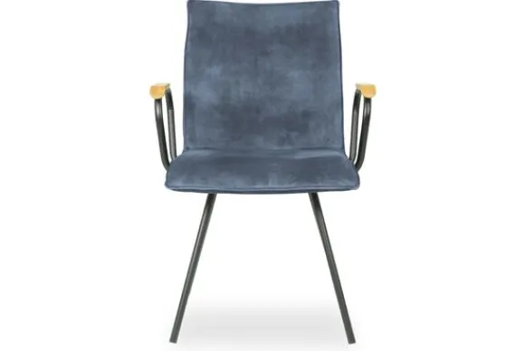 Eetkamerstoel Jussie van het merk Titan Design is beschikbaar in alle kleuren en in verschillende materiaalsoorten zoals stof, velvet en rundleder. De Jussie stoel is beschikbaar in diverse uitvoeringen. Deze Jussie is voorzien van armleuningen met een blank houten armlegger en zwart metalen poten. Deze stoel heeft een unieke uitstraling dankzij de opening tussen de arm- en rugleuning.