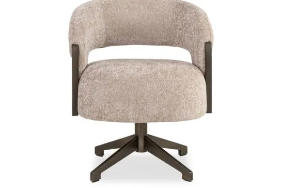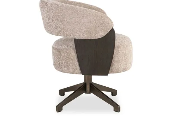 De eetkamerstoel is voorzien van een stevige, 360 graden draaibare poot in brons metaal. De combinatie van stof en hout past mooi binnen een modern of Japandi interieur.