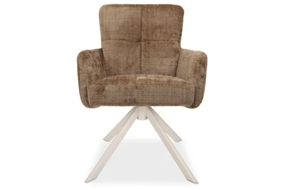 Eetkamerstoel Jari van het merk Veyron brengt warmte en comfort samen in een uitnodigend ontwerp. De volle zitting en afgeronde armleuningen zorgen voor een prettige en ontspannen uitstraling. Deze stoel is snel leverbaar en hier uitgevoerd in de stof Cremona Taupe 18 met metalen poten in de kleur beige.