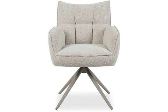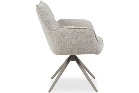 De draaibare spinpoot in de kleur taupe brengt een stijlvol contrast met de zachte bekleding. Dit samenspel van materialen zorgt voor een verfijnd geheel dat moeiteloos past in een scandinavisch of industrieel interieur.