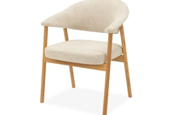 De royale zitting en licht gebogen rugleuning geven een prettig gevoel van steun. De stof heeft een subtiele structuur die zorgt voor een rustige uitstraling terwijl het houten frame een speels contrast geeft.