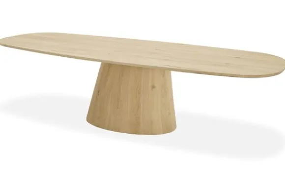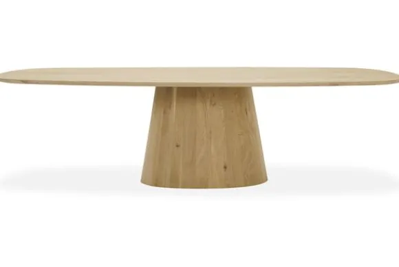 Eettafel Eira van het merk Premium Interior is uitgevoerd met een stomp ovaal blad en staat op een brede taps toelopende kolompoot. Het blad heeft afgeronde uiteinden en biedt een ruime en overzichtelijke tafelindeling.