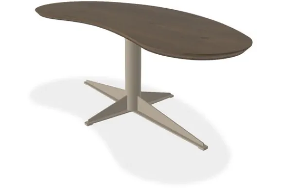 De centrale poot met gekruist onderstel zorgt niet alleen voor stabiliteit, maar geeft de tafel ook een luchtige en moderne look. Door de combinatie van het vloeiende blad en de strakke voet voelt deze tafel zich helemaal thuis in een hotel chic interieur, waar luxe en verfijning centraal staan. Tegelijk past hij door zijn unieke vorm en natuurlijke materialen ook goed in een bohemian interieur, waarin speelsheid en karakter samenkomen.