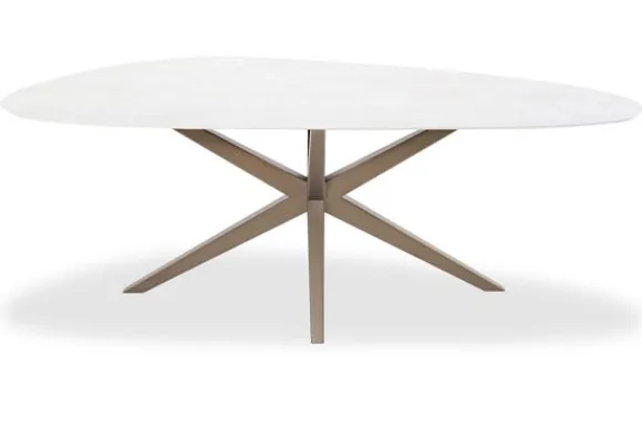 Deze eettafel wordt geleverd met een metalen poot in de kleur champagne.