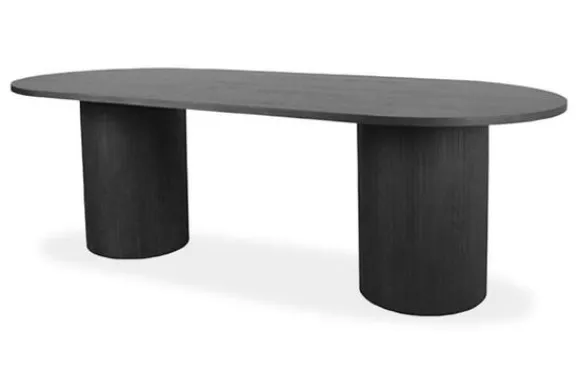 Eettafel Oliva Zwart ME-70.052 van het merk LABEL51 is een trendy meubel uitgevoerd in zwart eikenfineer. De afgeronde vorm van de tafel maakt het een strak en stijlvol meubel. Eettafel Oliva heeft een afgerond tafelblad dat rust op twee cilindervormige poten. De horizontale latjes op de poten geven de tafel een luxe look. Deze tafel past perfect in een modern en minimalistisch interieur.