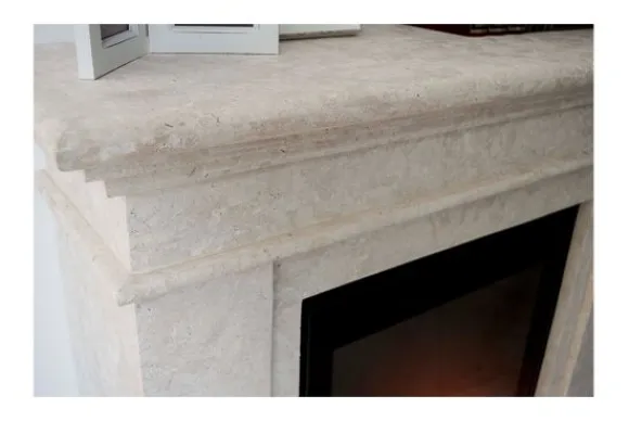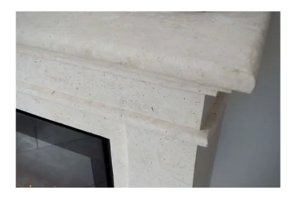 Deze haard wordt standaard uitgevoerd met een schouw van wit ongepolijst natuursteen en elektrische inzethaard Lucius.