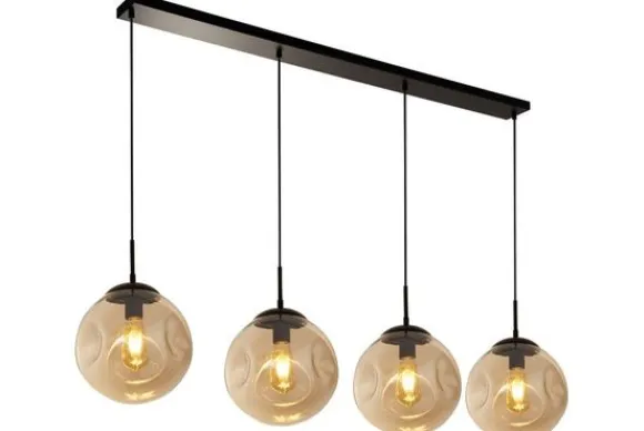 Hanglamp Punch 22123-4BK van het merk Searchlight heeft de naam ‘Punch’ te danken aan de deuken in de lamp, die een speels effect creëren. Deze zwarte lamp heeft vier champagne gekleurde glazen bollen die naast elkaar aan de plafondbalk hangen. Dit design staat goed in diverse interieurs, zoals retro, industrieel, modern of romantisch. Je kan zelf het soort licht uitzoeken, door een lamp te kiezen die op de E27 fitting past. Afhangend van de lamp die uitgezocht wordt, is deze lamp dimbaar.
