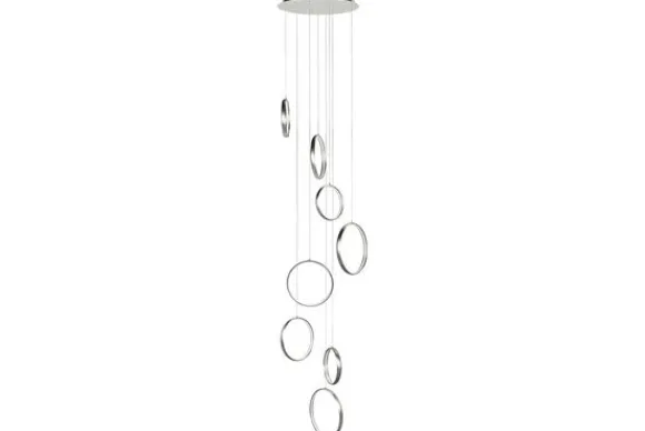 Hanglamp Olympia Zilver van het merk Highlight bestaat uit acht zilverkleurige ringen die een diameter van 25 cm, 30 cm en 35 cm hebben. De ringen zijn los van elkaar in hoogte te verstellen. De lamp heeft een maximale lengte van 330 cm. De plafondbevestiging heeft dezelfde kleur als de ringen en heeft een diameter van 56 cm. In de ringen zitten LED-strips die collectief 70W verbruiken.