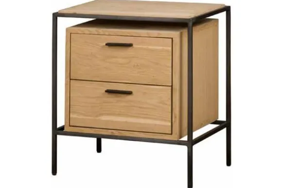 De kast is gemaakt van eiken fineer in combinatie met een metalen frame en heeft twee lades.