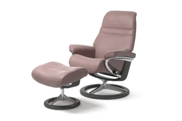 Relaxfauteuil Sunrise Signature van het merk Stressless is verkrijgbaar in alle kleuren. Tevens is de fauteuil leverbaar in stof en rundleder. Je kunt bij deze fauteuil kiezen uit diverse maten zoals Small, Medium en Large. Deze fauteuil heeft een Plus en Glide Systeem: Aan beide zijden van de fauteuil zit een knop waarmee je de weerstand van de stoel kan aanpassen naar eigen behoefte. Door de knoppen in tegengestelde richting te draaien stel je jouw ideale relaxpositie samen. Op die manier krijgt de nek en de onderrug goede ondersteuning. Door de rugleuning naar voren te buigen activeer je de slaapfunctie. Op het moment dan je weer rechtop komt stelt de stoel zichzelf weer bij naar de normale stand.