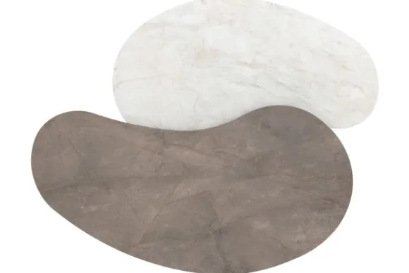 De tafelbladen hebben een organische vorm en zijn gemaakt van hpl. De kleine tafel heeft een blad in de kleur Decolegno FD77 en de grote tafel heeft een blad in de kleur Decolegno FD21.