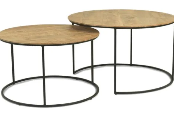 Het set is hier te zien met tafelbladen in de kleur Mango en bestaat uit een set van twee ronde salontafels. Het tafelblad is ook verkrijgbaar in andere kleuren en aan te passen naar wens.
